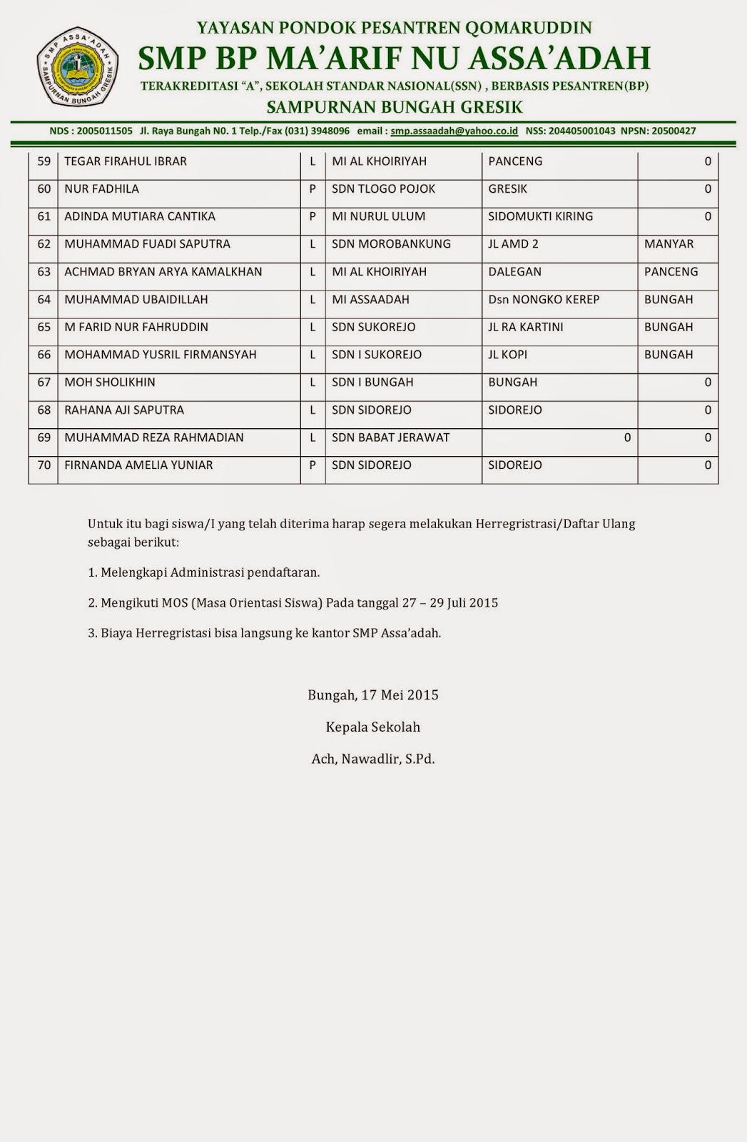 3. Biaya Herregristasi bisa langsung ke kantor SMP Assa’adah.